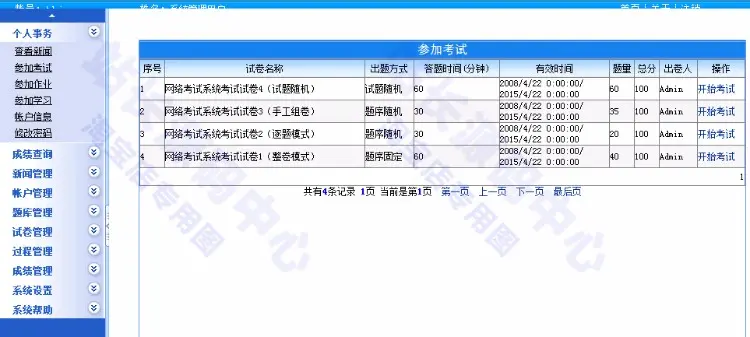 网络考试系统是一套可以用于学校、企事业单位和培训机构等在互联网和局域网上实现无纸化考试学习、新闻管理、帐户管理、题库管理、试卷管理和成绩统计等于一体的集成软件。通过努力,现在隆重推出,主要功能和特点如下:■系统基于微软先进的.Net平台,纯B/S架构模式,系统部署、维护方便,具有良好的开放性、伸缩性和可扩展性;■系统试卷分为考试模式和作业模式,考试模式自动计时,作业模式不计时,可用于平常作业或练习;试卷出题方式可采用题序固定、题序随机或试题随机模式;试卷显示方式分为整卷模式和逐题模式;试题随机和逐题模式可有效防止作弊;■支持自定义题型功能,系统提供单选类、多选类、判断类、填空类、问答类、作文类、打字类和操作类等八大类基本题型,其中操作类试题提供了文件下载和上传功能,轻松实现Word、Excel、FrontPage、Visual Foxpro等对文件或文件夹的操作;■系统可对试题的科目、知识点、题型、难度、分数、试题内容和试题解析等属性进行设置,单选类、多选类试题支持6个选项,完全可以满足当前试题要求,少于6个选项,在考试时自动隐藏;■试题内容丰富,试题中可插入图片、音/视频、表格、Flash动画和数学公式等,全面支持听力测试、语音辨析、音/视频赏析等试题,其中数学公式编辑器极大的方便了理科考试,真正实现了多媒体试题;■多种组卷模式,既可以单科目组卷,也可以多科目综合组卷;可在试卷策略中按科目、知识点、题型和难度随机抽取试题组卷,也可手动自由选择试题进行组卷;可将试题按试题分数或按题型指定分数折算成试卷总分;可设置题型显示顺序等属性;■方便的试卷答卷导出功能,系统可将试卷和考生答卷以Word格式导出,无须再进行任何排版便可直接打印,实现了传统考试制卷和考生答卷存档功能;■支持帐户和试题批量导入导出功能,系统可将Excel格式帐户文件和试题文件批量导入到系统中,建立基础数据更加方便快捷;■强大的答卷统计功能,系统可对考生答卷按成绩、知识点、题型和试题得分进行统计,并以图表形式直观显示,体现了考试的评价和导向功能;■提供学习和培训功能,系统通过电子书籍可发布用于考试、作业和培训等的教材内容,用于考生在线学习和提高,科目章节内容丰富,可方便插入图片、音/视频、表格、Flash动画和数学公式等多媒体内容,也可上传附件供用户下载使用,科目章节以树型结构呈现,结构清晰,层次分明,极大的方便了用户浏览和学习;■灵活的帐户管理功能,系统帐户分为系统管理员、管理员和普通帐户三类,其中系统管理员拥有权限,管理员拥有建立新闻、帐户、试题和试卷等权限,可为管理员设置评卷帐号、评卷题型和角色菜单等权限,普通帐户拥有查看新闻、参加考试、参加作业和成绩查询等权限;■支持屏蔽Alt+Tab等系统热键和锁屏功能,极大的防止考生作弊;支持检查答卷功能和错题显示功能。
