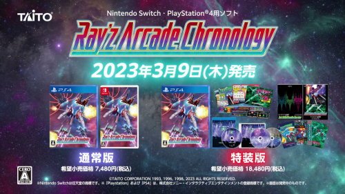 发行商TAITO和开发商M2发布了纵屏射击街机游戏《镭射街机合集》的预告片。该作中共包含五款游戏,将于2023年3月9日在日本发行,登陆PS4和Switch主机,普通版税后售价7480日元,特装版18480日元。